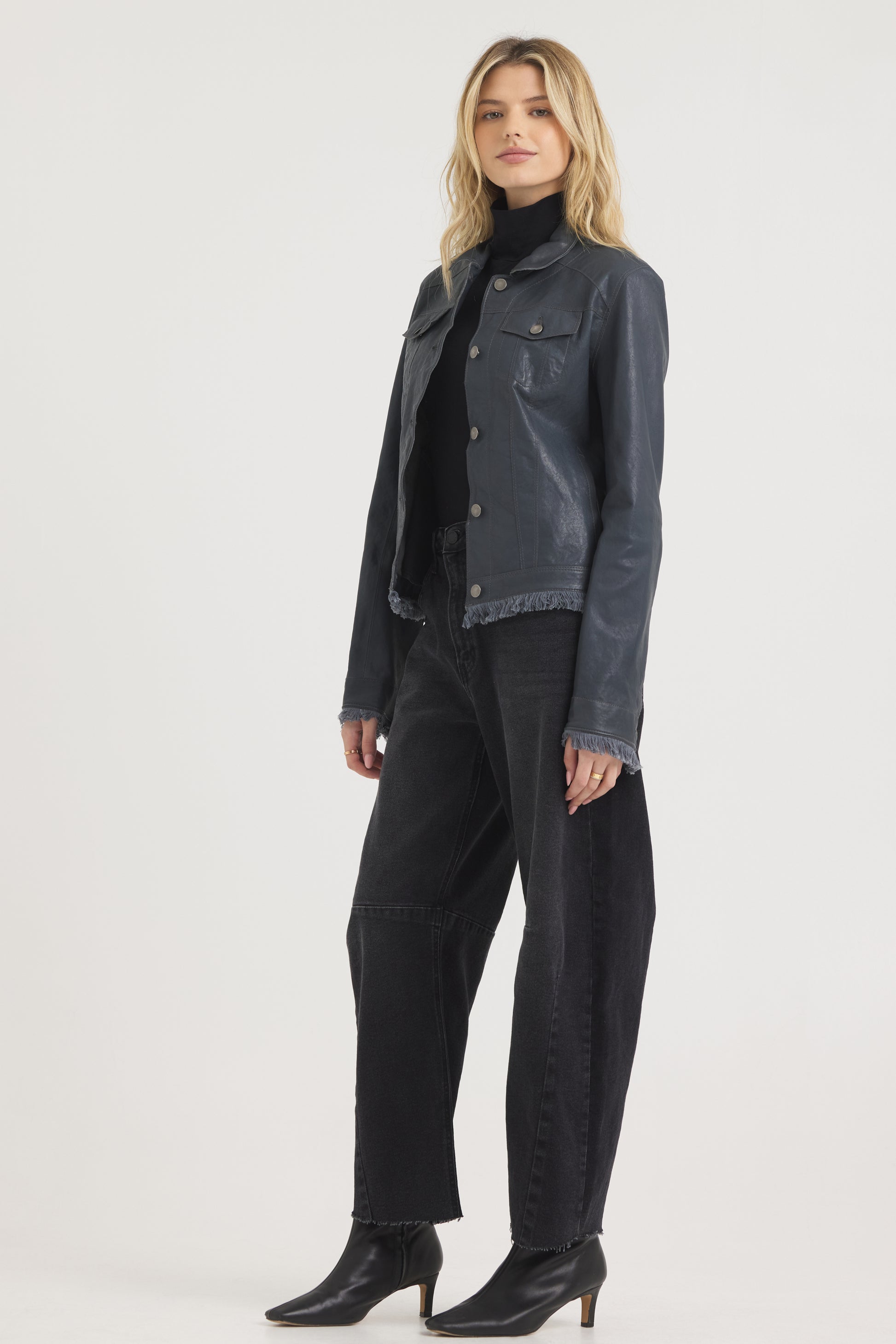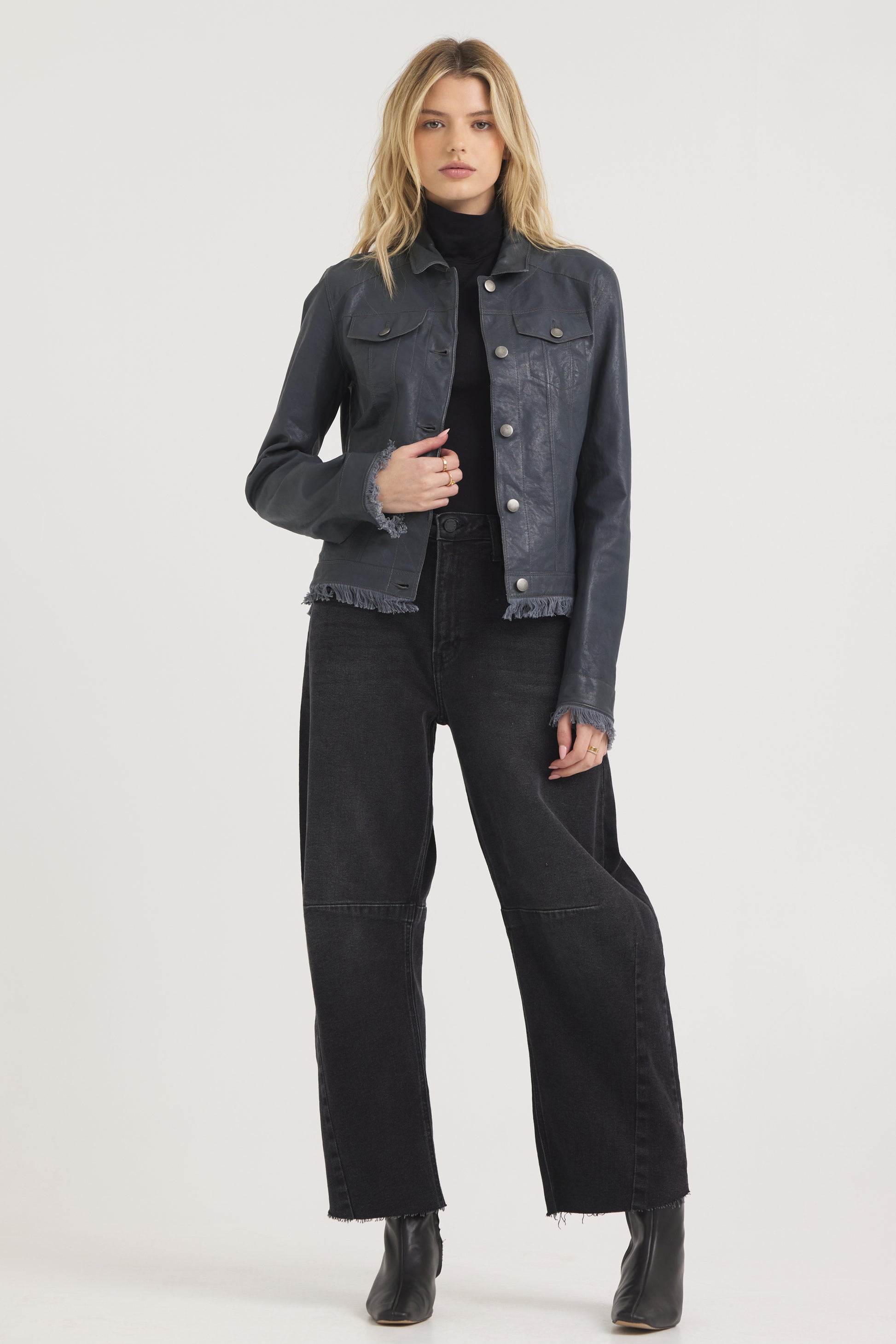 Boho Queen! A cropped leather jacket with classic jean detailing featuring a frayed bottom hem and sleeves. Pair with a flowy maxi skirt and your most lived-in riding boots for a look that’s a little bit country and a little bit rock and roll.