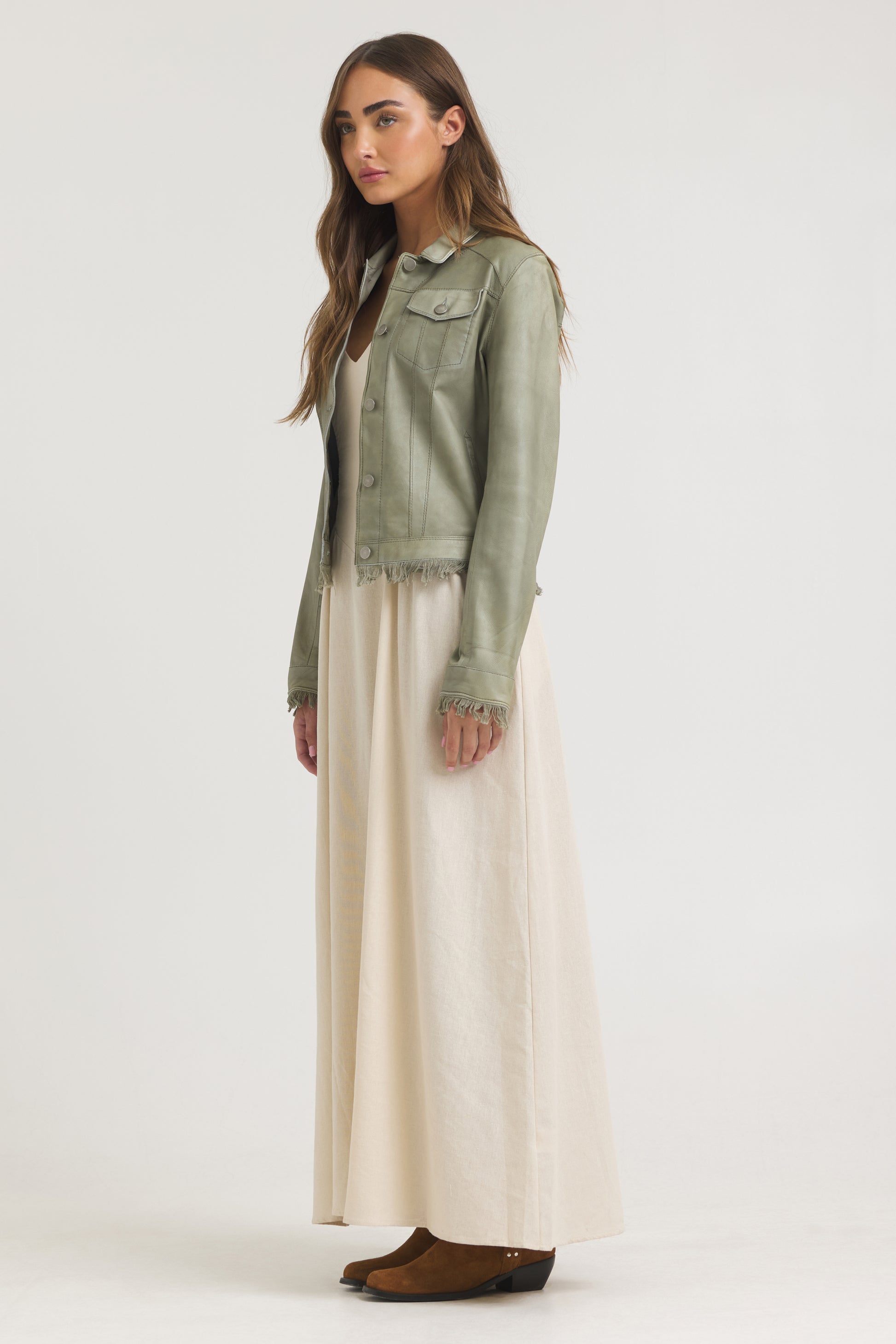 Boho Queen! A cropped leather jacket with classic jean detailing featuring a frayed bottom hem and sleeves. Pair with a flowy maxi skirt and your most lived-in riding boots for a look that’s a little bit country and a little bit rock and roll.