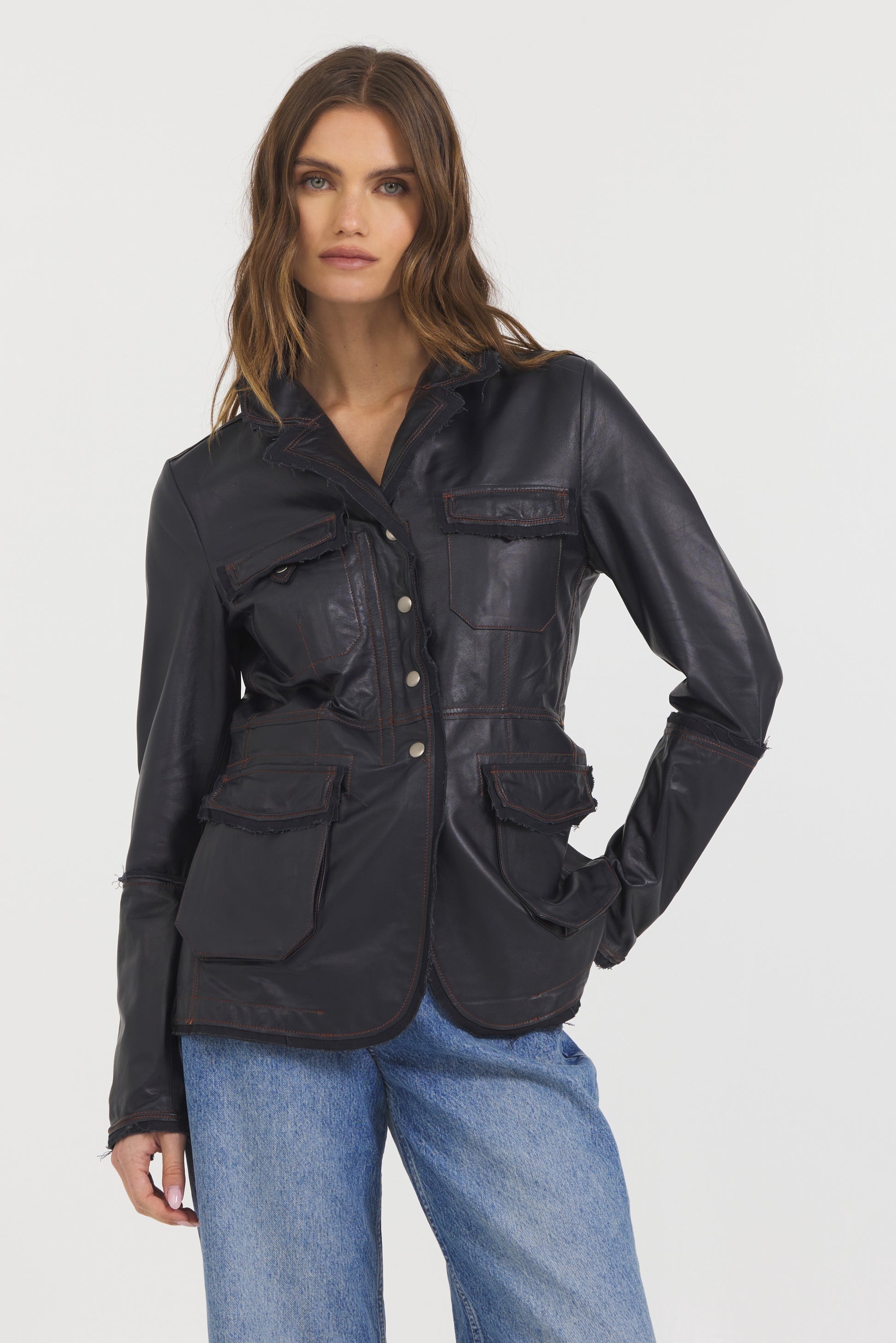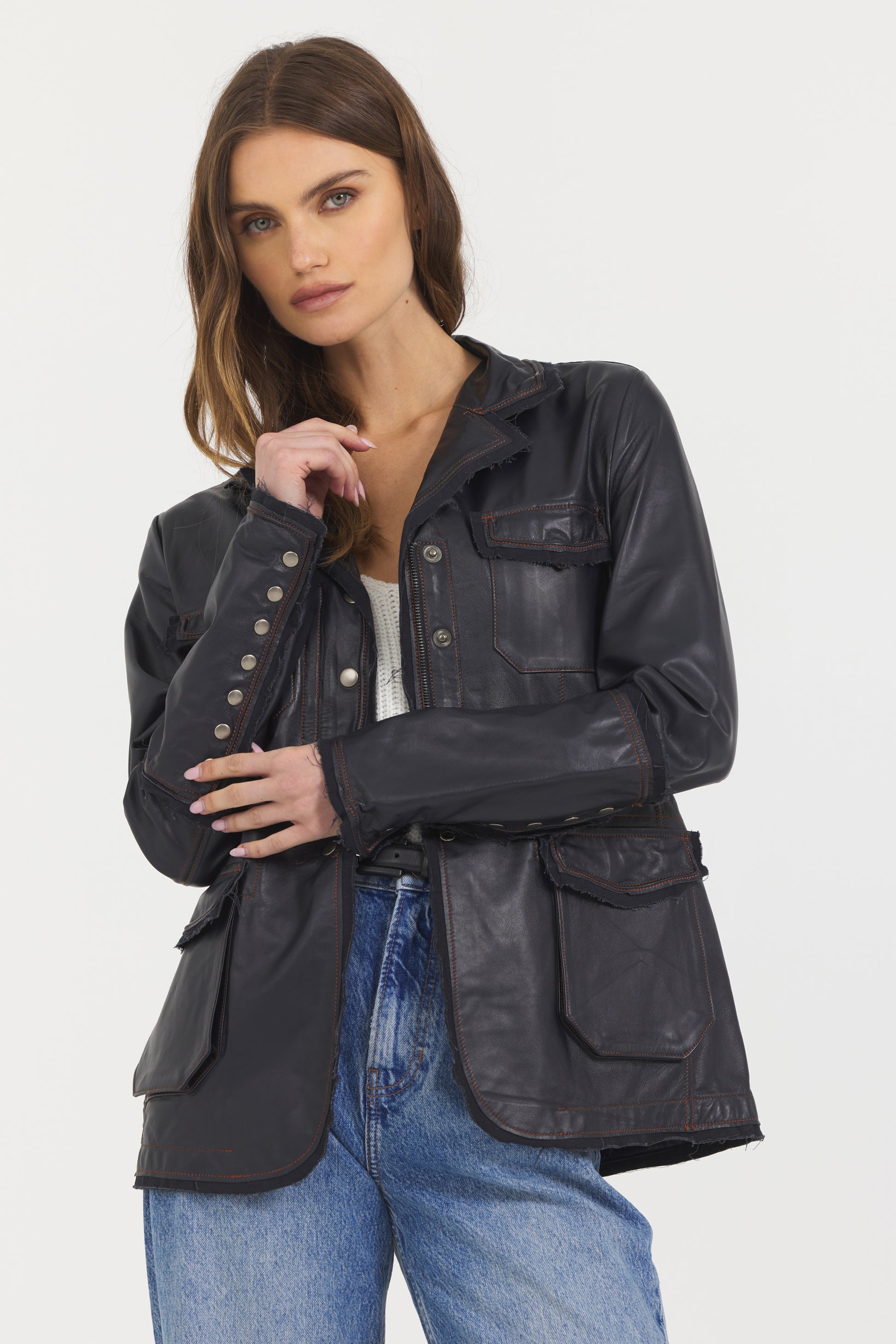 Snap it up.  A long-line, slim fit vintage look with deconstructed fringe seam detailing marries rough and ready style with soft sophistication.  Pair with your favorite jeans and a tank and be ready to be seen.
